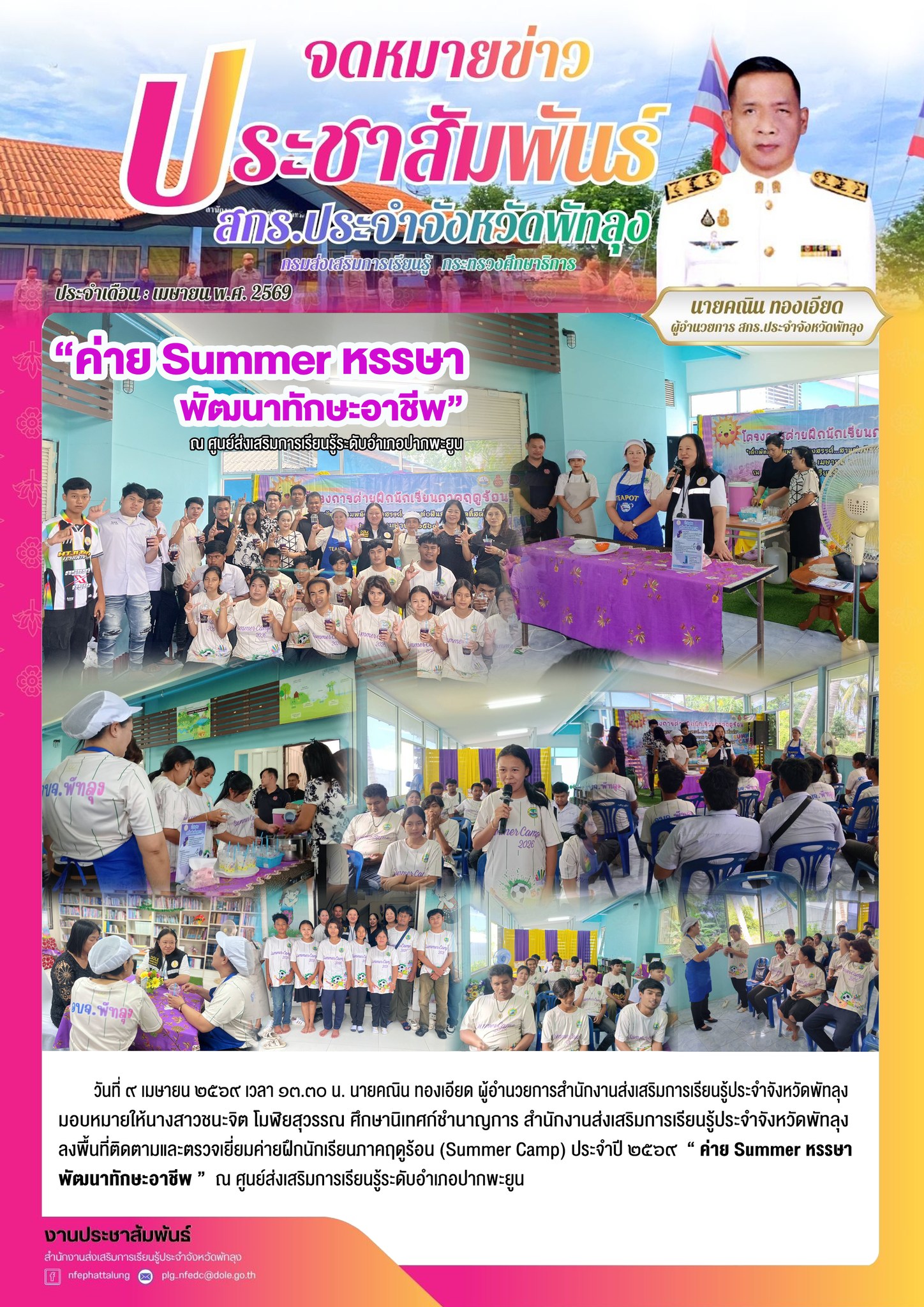 ลงพื้นที่ติดตามและตรวจเยี่ยมค่ายฝึกนักเรียนภาคฤดูร้อน (Summer Camp) ประจำปี ๒๕๖๙ “ ค่าย Summer หรรษา พัฒนาทักษะอาชีพ ” ณ ศูนย์ส่งเสริมการเรียนรู้ระดับอำเภอปากพะยูน